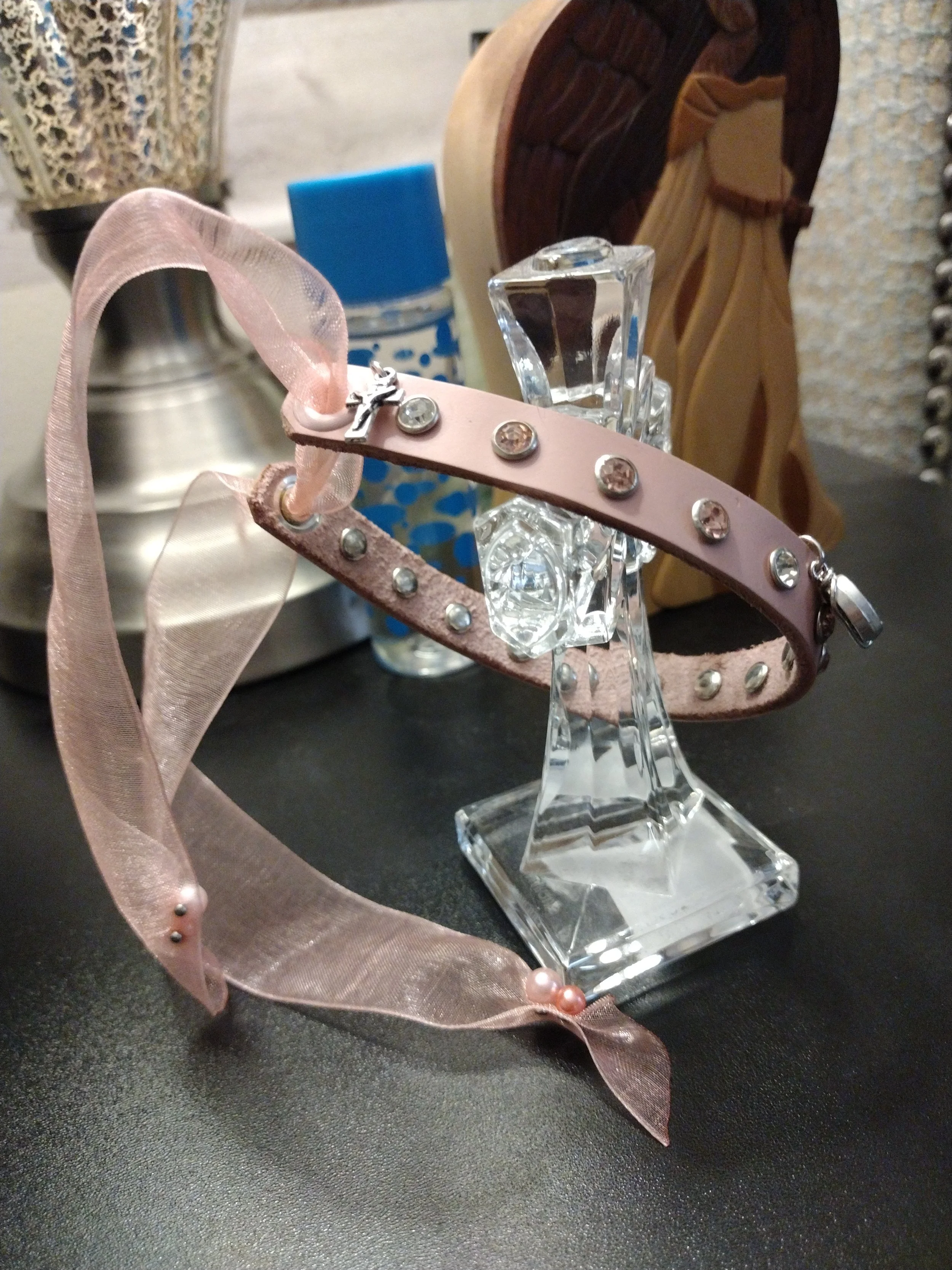 Like wings in flight, a sheer ivory ribbon punctuates this au naturel 1/2 inch leather strap encircled by faux ivory pearls. A silver oxidized cross and mother Mary medal are affixed to the bracelet. Made slightly oversized to sit lower on the wrist comes in wide and narrow strap width in the colors chestnut and brown.