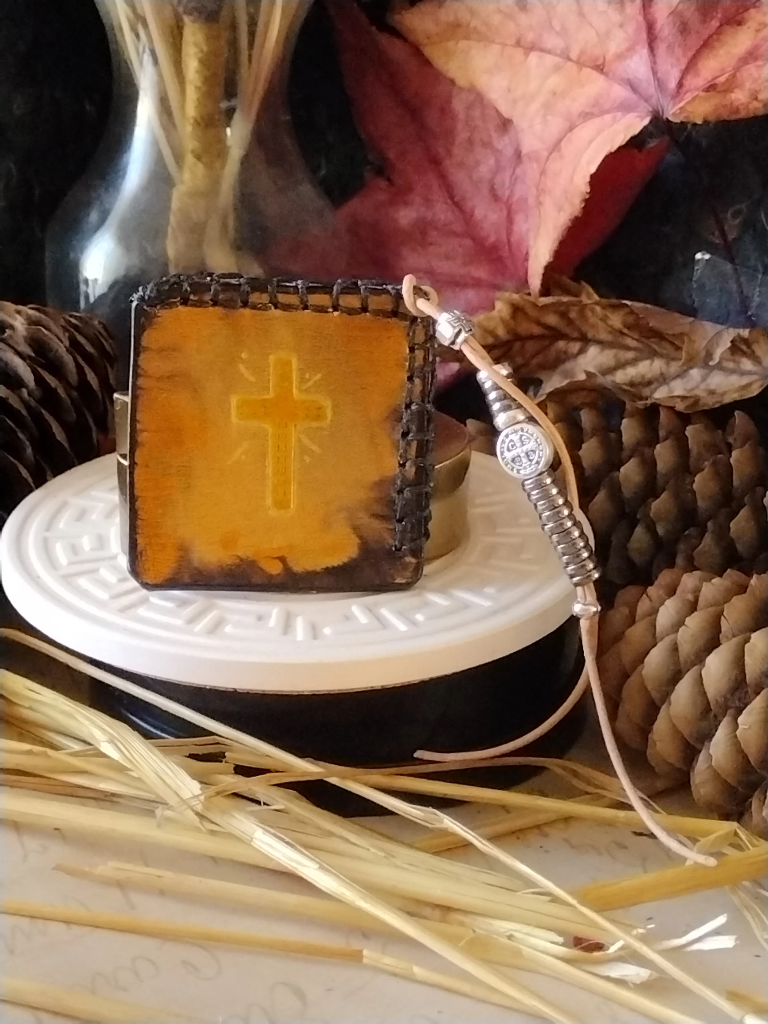 Leather and cork booksquare handstitched with a mini decade rosary hanging from the corner. The cork side is lined to help grip the page and the decorative stitching peeks out when the book is closed. Currently available with heart, cross or RB logo only. Personalize with name, initials or add initial beads to the Rosary. **Personalization must be approved and will be final sale.